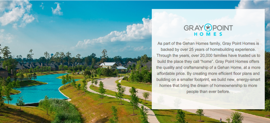 “Gray Point Homes will now be marketed in our first time/entry level communities. This brand will become synonymous with the same core values as Gehan Homes while providing market segmentation to address a maturing housing cycle”, said John Winniford, Chief Executive Officer. “The brand will incorporate our new 30’ and 40’ wide product that has been developed over the last year. These plans fit the need for an emerging market looking for high quality affordable housing.”