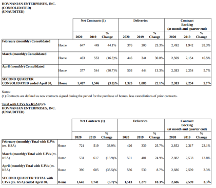 In the 8K filing, Hovnanian provided the following operational metrics: