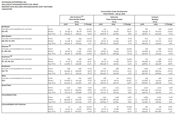 As of July 31, 2016, the number of homes in contract backlog, including unconsolidated joint ventures, decreased 1.3% to 3,232 homes compared with 3,275 homes as of July 31, 2015. The number of homes in consolidated contract backlog, as of July 31, 2016, decreased 4.1% to 2,969 homes compared with 3,097 homes as of the end of the third quarter of fiscal 2015.