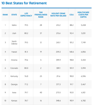 From personal finance site, MoneySavingPro, here’s a “10 Best States to Retire“ line-up that filters for life expectancy, tax friendliness, (low) violent crime rates, (low) healthcare costs, and (low) cost of living index.