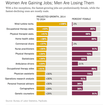 Still, the other interesting thing about occupational opportunity is that many of the faster-growing job types are ones traditionally done by women, not men. Here, New York Times columnist Clair Cain Miller explores why men don’t gravitate to jobs they associate with as women’s occupations, even as technology, automation, robotics, etc. are eliminating more traditionally male occupations.
