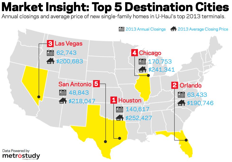 Using Metrostudy’s portal, we’ve pulled annual closings and average closing prices of new homes in each of the top 5 destination cities from U-Haul’s list (by MSA/County). Future forecast for 2014? I’m placing my bets on San Antonio to move further up the list.