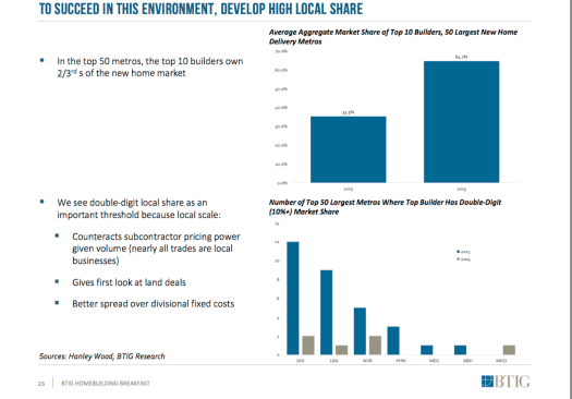 A motivation or source of urgency that makes a lot of sense to us when it comes to the public builders is a notion BTIG analyst Carl Reichardt refers to as deep local share, where a builder penetrates a faster-growing market with comparably outsized volume of units in order to gain profit margin advantage.