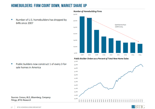 So, the biggest of the big builders have grown in market share, and, for some time now, the realization has been setting in that the “low hanging fruit” era of the recovery, consisting of the ability to fix many of the broken deals and add value to many of the distressed deals of the Great Recession, is over and done with. So the quick, quantum-leap volume increase days are out, and the hard-working, more complex and tricky deals come into play.