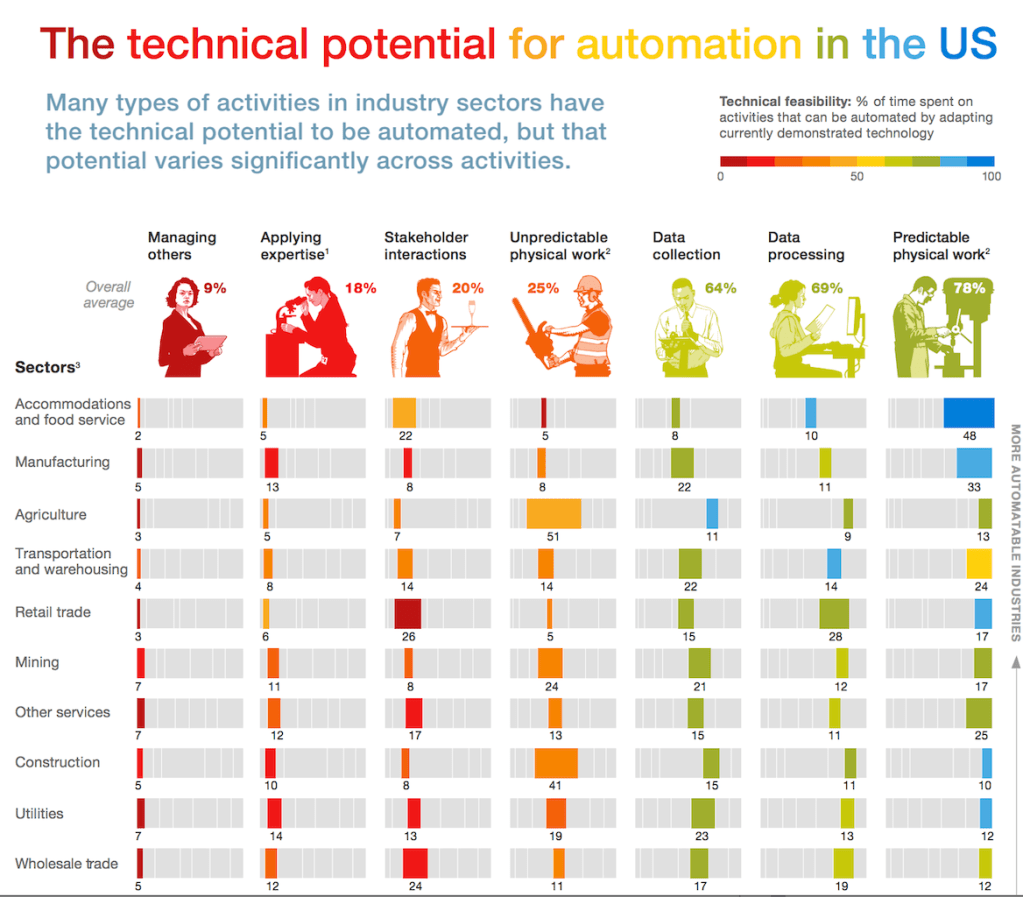 “Activities in the middle range of the technical potential for automation involve large amounts of physical activity or the operation of machinery in unpredictable environments. These types of activities make up a high proportion of the work in sectors such as farming, forestry, and construction and can be found in many other sectors as well.