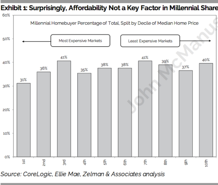 For the most recent measurable period, this young-adult segment represents just under 2 of every five mortgage originations in the nation’s largest markets. Zelman analysts note: