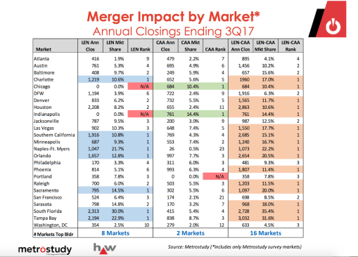First, let’s take a look at Metrostudy analysis of the effect of the Lennar-CalAtlantic combination, a deal whose per-lot cost would clock in–subtracting for debt–at about $138,000 per home site across the national portfolio, with a healthy concentration of California lots.