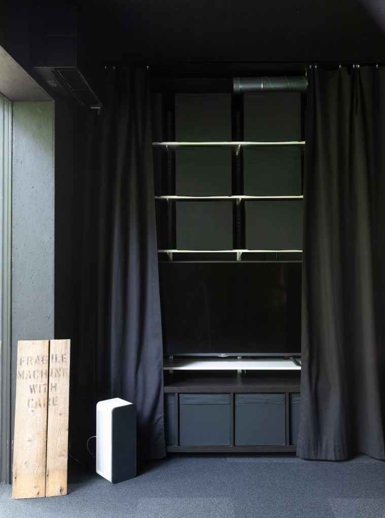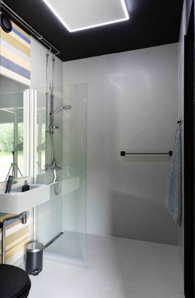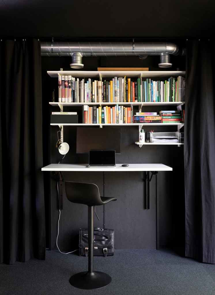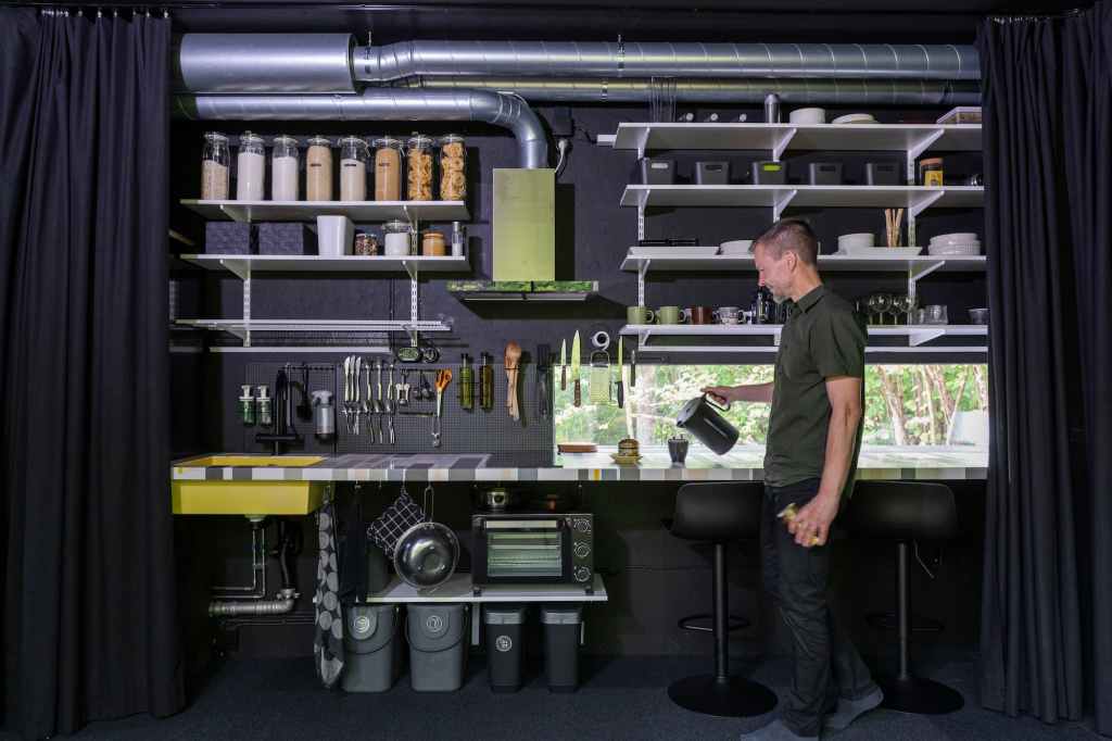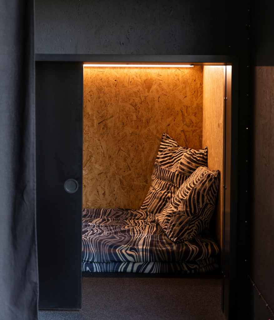 Inside, Tiny House Shadow embraces minimalism not just as a design aesthetic, but as a lifestyle principle. Kuittinen has packed surprising versatility into its small footprint: curtains allow the main living area to transform for working, dining, or sleeping; Japanese-style capsule sleeping pods stack vertically to save floor space; the kitchen dispenses with bulky cabinets in favor of open shelving, reducing material use while keeping everything in sight.