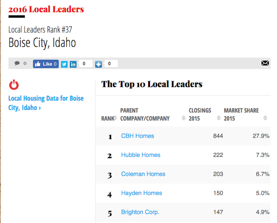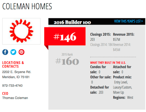Now, Coleman ranks No. 3 in its share of the Boise market, per our Local Leaders data, and No. 146 in our top 200 count of the Builder 100 rankings. In 2015, Coleman reported revenue of $57 million on closings of 203 units, a growth of 27% in revenue over the prior year and 10% in unit volume.