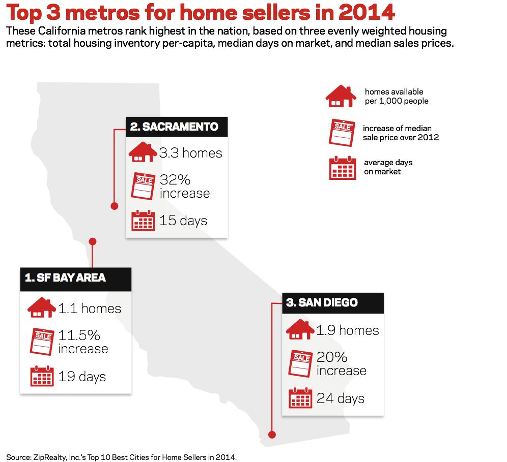 According to ZipRealty, Inc., (a residential real estate brokerage firm and marketing solutions provider) California is the place to be if you’re selling a home in 2014.