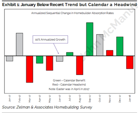 A disproportionate share of new home orders is signed on the weekend when buyers are more available. On average, over time, January and December typically have the same number of weekend days, but this January had two fewer weekend days than December. The timing of the holidays complicates how impactful these days could have been, but we feel confident stating that sequential trends would have stood at or above the high-end of the 24-31% range for January from 2012-17.