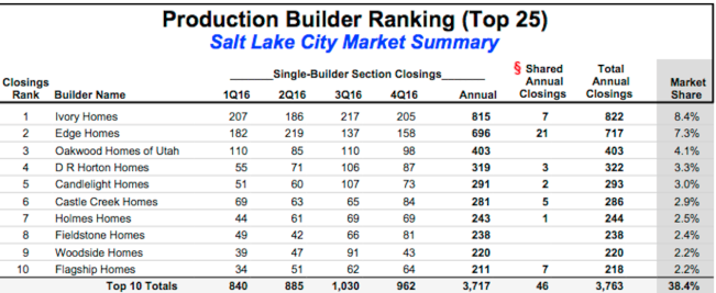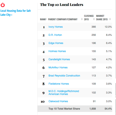 Our Local Leaders lists Salt Lake as the No. 36-largest home building market, with Edge as the No. 3 builder in the Salt Lake market, trailing only Ivory Homes and D.R. Horton, with 2015 market share of 6.4%.