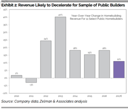 As a peer-group bucket, investment analyst and advisor Ivy Zelman and the Zelman & Associates team believe that big builders will absorb the psychological hit of rising interest rates in the first half of the year, and then regain hefty, double-digit growth momentum in the latter half. The Z Report, a bi-weekly analysis focusing exclusively on rich content for executives and business leaders overlapping the apartment, building products, homebuilding, home improvement, mortgage, real estate services, single-family rental and title insurance industries, looks at the public builder 2017 prognosis this way.