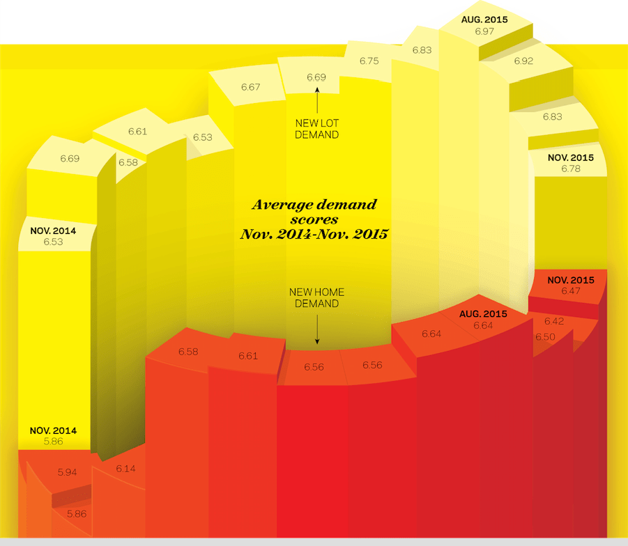 Demand for new homes is strong across all buyer segments, and demand scores from Metrostudy regional directors show positive gains year over year. The average score for new-home demand across all markets increased more than 10% in November to a score of 6.47, compared with 5.86 in November 2014. However, while higher demand increases production, builders are still missing the mark for potential buyers who would like to purchase a home but cannot afford the product that builders are selling.