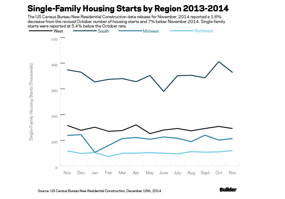 There was no evidence of a strong pickup in home construction in the final months of 2014. According to the Census Bureau data released this morning, housing starts in November were at a seasonally adjusted annual rate of 1,028,000. According to the Bureau, this is 1.6 percent (±8.1%) below the revised October estimate of 1,045,000 and is 7.0 percent (±10.2%) below the November 2013 rate of 1,105,000.