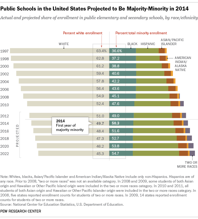 Washington Post staffer Emily Badger picks up on Pew Research data that shows that public school enrollment is growing more diverse–2014 will be the first “majority-minority” enrollment year–but that doesn’t mean public schools are.