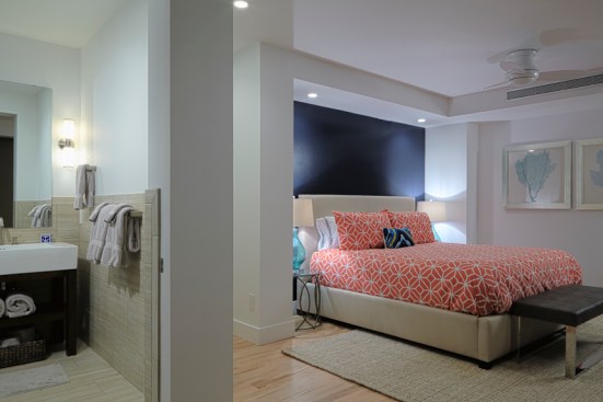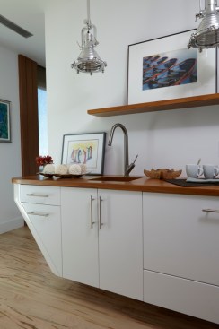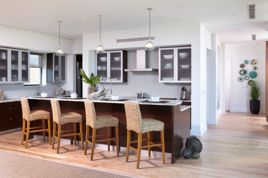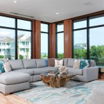 Inside, a linear fireplace on the west wall warms the open concept floor plan that places living, dining and cooking areas under one ceiling. Finishes include wenge wood cabinets, marble countertops, and wormy maple floors. The homeowners—NASCAR entrepreneur Will Spencer and his wife and their dogs–enjoy views from both the master suite’s second-floor porch and rooftop deck that sits 40 feet above sea level.