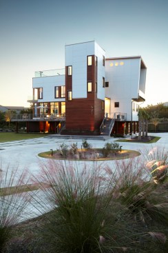 Engineered to withstand blistering nor’easters and Atlantic hurricanes, the home is a model of resilient building materials like Fry Reglet rainscreen cladding, James Hardie manufactured concrete panels, resilient sapele siding, and Kawneer Glass Systems, were selected for their ability to stand up to coastal storms.