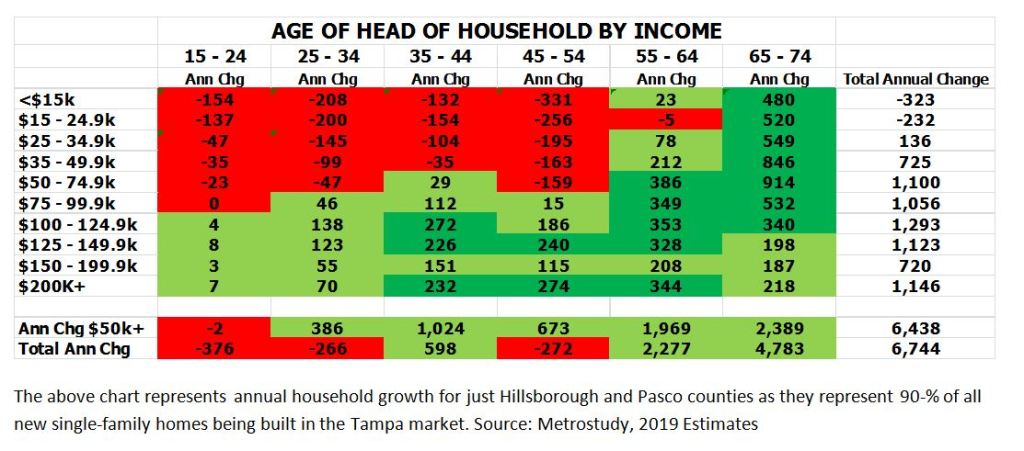 So, where does growth come from over the next five years for new home builders? While Florida, as a whole has certainly established itself as a desirable choice for retirees, Tampa has typically focused on family buyers. Demographics will change this. Claritas estimates for household growth between 2014 and 2019 indicate that “Baby Boomers” and not millennials will drive demand for housing in Tampa Bay. The year 2019 is significant as 100% of the Baby Boom (defined as those born between 1946 and 1964) will be age 55 and older.