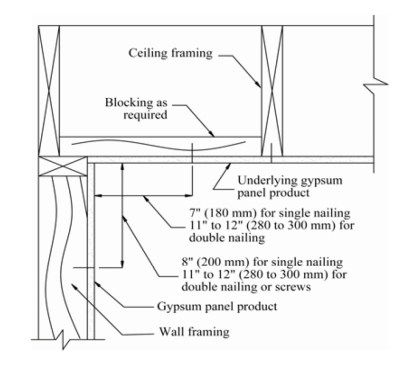 Nailers at the edge of ceilings (above) don't allow drywall installers to hold fasteners back from the corner. Instead, install blocking as shown below.
