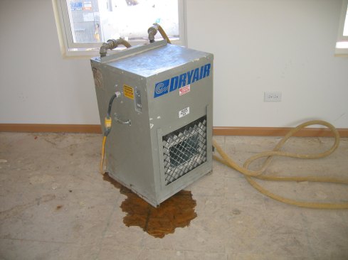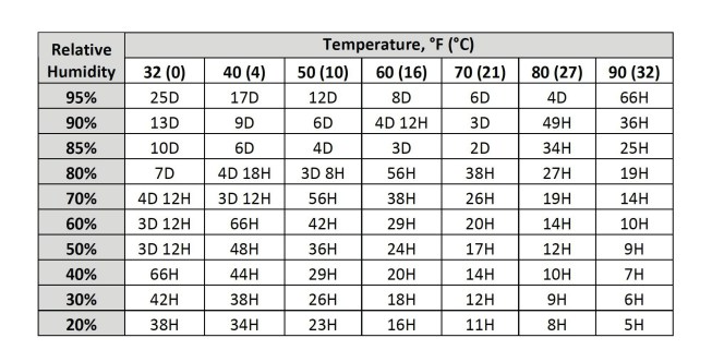 Temperature and humidity affect the time that it takes for a coat of drywall mud to dry. The chart below indicates the time required for a range of temperature and humidity conditions. Some builders use portable propane-fueled salamander heaters for temporary heat, but it’s important to realize that propane combustion releases 7.8 pounds of water for every gallon of propane burned, and will significantly increase the relative humidity in the building. It’s better to use dry heat such as the equipment shown here. When using temporary heat, make sure to apply it evenly throughout the building.