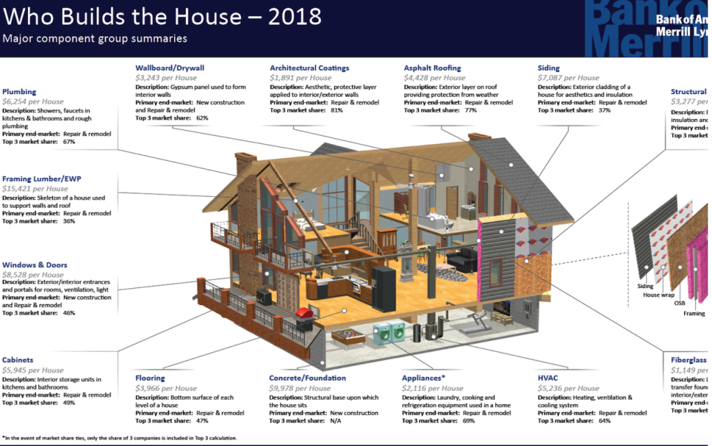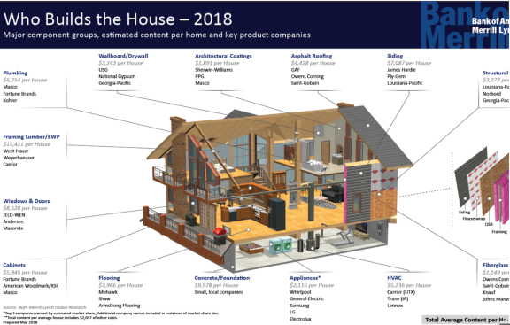 A new Bank of America Merrill Lynch report–“Who Builds the House”–subjects both the new residential and remodeling market places to a fascinating market “sizing” research exercise, aggregating and averaging data in such a way as to show a model for materials and products input costs. Although America’s thousands of home builders don’t buy, build, or model their businesses on averages, estimates, or aggregates, the analysis of 14 major product and materials component groups is helpful in revealing why all the fuss about price inflation pressures as builders work to subtract costs and offer lower-priced home models.