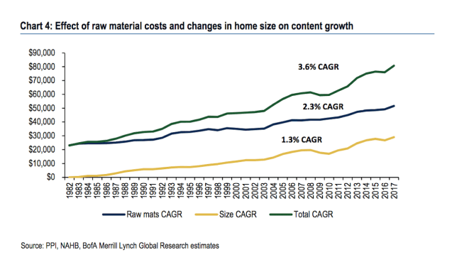 Based on 18 distinct producer price indices (including “other” category), we estimate that the raw material content in an average single-family home increased from roughly $23,073 in 1982 (base year, index=100) to $51,523 in 2017, representing a CAGR of approximately 2.3%. In addition, the average square footage of floor area in a new single-family home increased at a 1.3% CAGR from 1,710 to 2,674 over the same period. Given that 1982 was the base year for this analysis, the size impact rose from $0/home in 1982 to $29,044/home in 2017. For consistency, we employ the same size factor (current year average square footage/1982 average square footage) for each component group. The sum of the raw material and square footage inputs equate to our total content per home estimate in each year. Therefore, we estimate that total content in an average single-family home increased from $23,073 in 1982 to $80,566 in 2017.