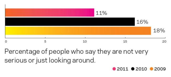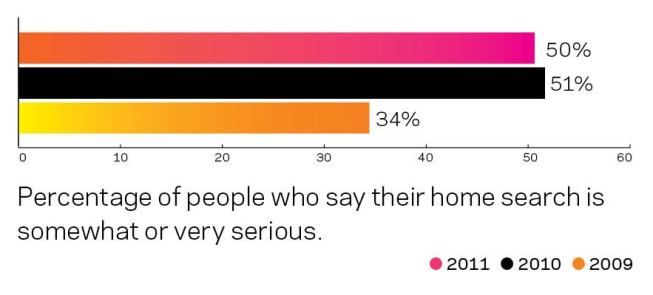But here’s the catch: They have commitment issues. Of the group, 46 percent said they have been looking for a new home from three months to a year, up from 40 percent in 2010. And 21 percent said they had been looking for more than a year, up 6 points over 2010.