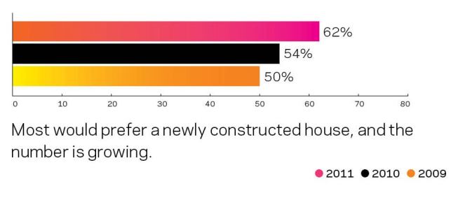 On another high note, the group overwhelmingly (62 percent, up from 54 percent last year) said they preferred only a newly constructed home. Since these buyers were visiting new-home sales centers, this shouldn’t be surprising, though the percentage increase is certainly worth noting.