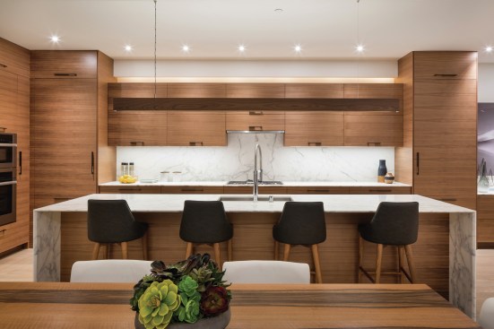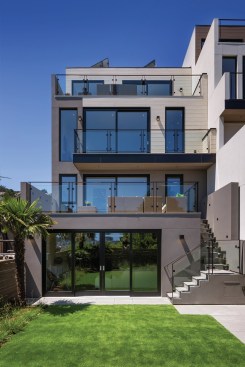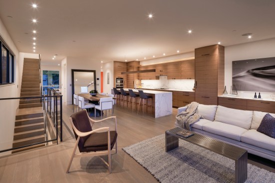 “The house is its own mini-environment,” says principal architect Mark Thomas. The 4,696-square-foot space is conditioned by two Zehnder ComfoAir 350 HRVs. An HRV’s small ducts are easy to conceal, which is helpful for achieving the streamlined look of contemporary architecture. The four-level house is clad with an integrally colored composite material called Woodn, integrally colored stucco, and aluminum fascia.