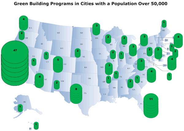 Not surprisingly, the Western region is leading the charge, with 56 cities in just six West Coast states representing 41% of all green building programs. The Mountain region boasts the second greatest share of green initiatives (24%), although the East Coast has seen a 75% jumpe in the last two years, with 49 Eastern cities now reporting formalized efforts to improve energy efficiency, reduce waste, and lower carbon emissions.