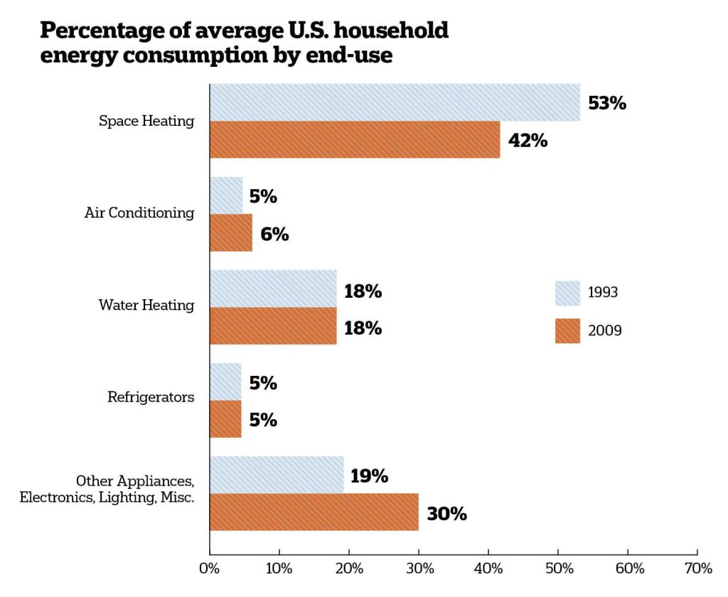 Researchers at the U.S. Energy Information Administration (EIA) have released interesting new data showing changes in household energy consumption. For decades, space heating and air conditioning accounted for more than half of the country’s residential energy consumption. Estimates from the 2009 Residential Energy Consumption Survey2009 (RECS) show that number has dropped to 48%, compared with 58% in 1993.