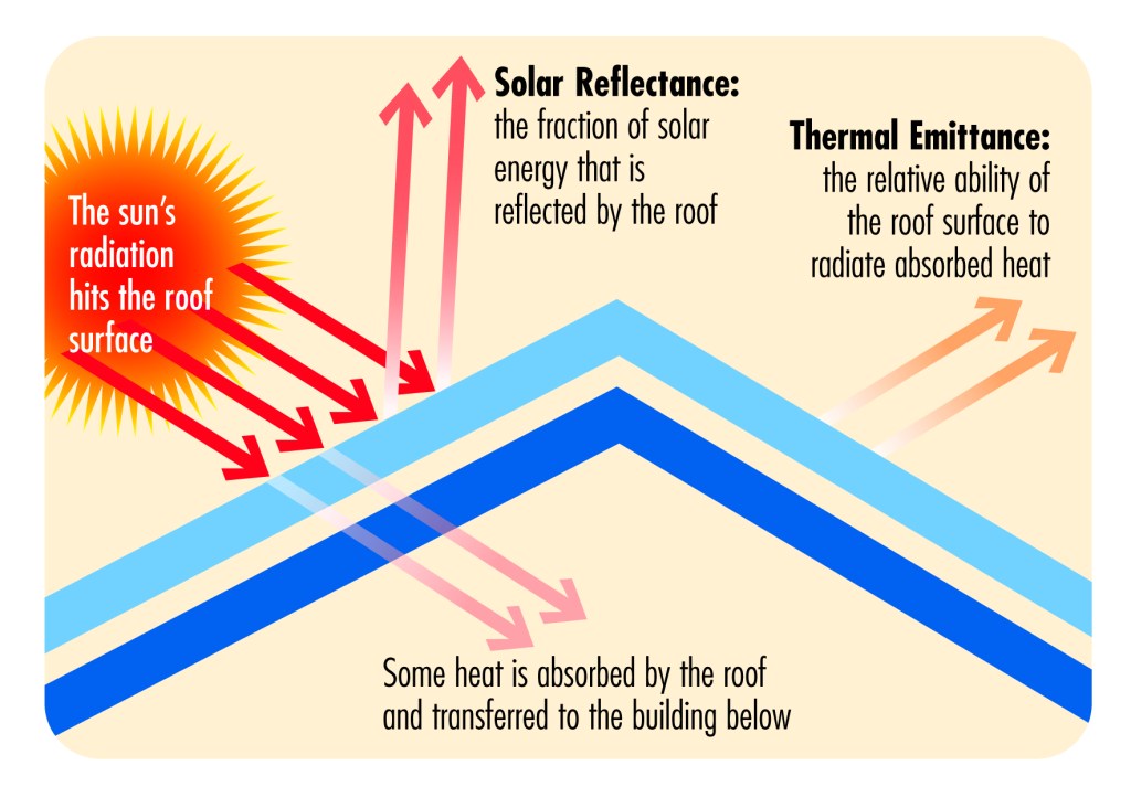 How does the SRI work? Roofing materials are characterized by their reflectance and by their emittance. Solar energy striking a roof is either reflected or absorbed; if it’s absorbed, it may still be re-emitted to the sky as infrared energy. Reflectance is expressed as a number between zero and one (or as a percent between 0% and 100%). Emittance is expressed the same way — either on a scale from zero to one, or on a scale from 0% to 100%.