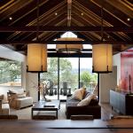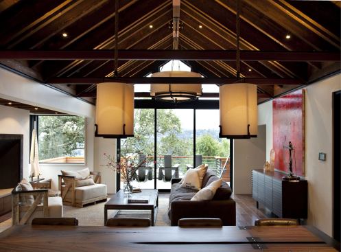 This Mill Valley, Calif., house owes much of its rustic good looks to the darkly stained, rough-hewn Douglas fir ceiling beams that were reclaimed from an Idaho pea processing plant.