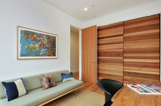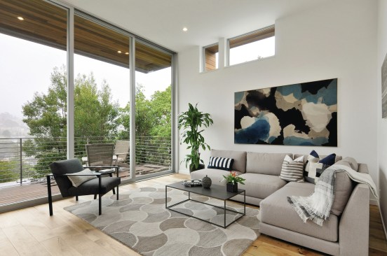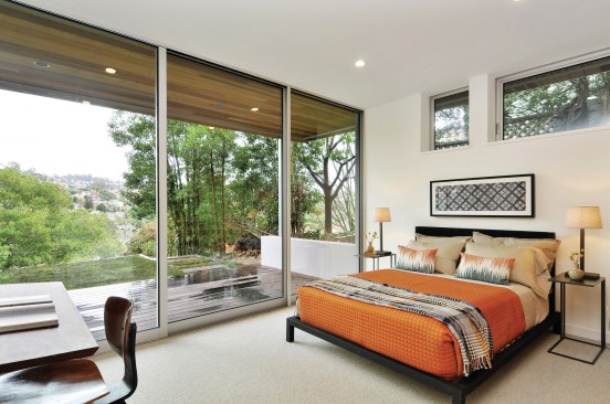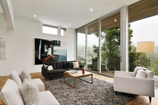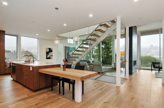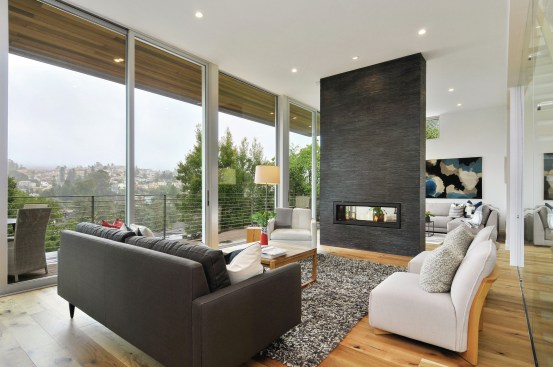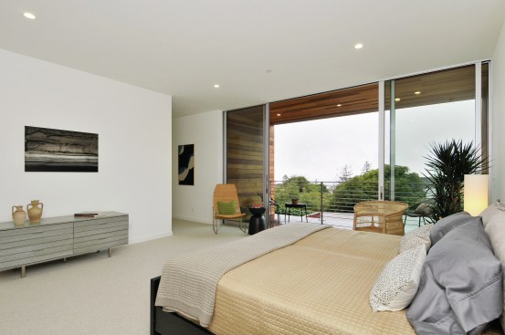Currently on the market for $3 million, the home features bay and canyon views, floor-to-ceiling windows, five bedrooms, and a gourmet kitchen with Thermador appliances. Machined in the same factories used by the automotive and aerospace industries, the home also features a glass-enclosed stairway, see-through fireplace, and 40 foot wide deck.