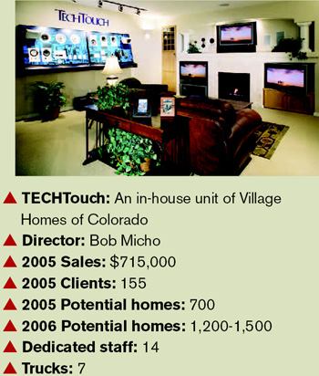 A CASE IN POINT The TECHTouch division of Village Homes of Colorado, based in Englewood, has done all that, and has gained one other significant benefit: It makes money. Village Homes, which is a private company, won’t disclose financial information, but Bob Micho, director of TECHTouch, says the unit is coming off a record quarter in sales and did $715,000 in revenue last year, servicing 155 home buyers. (Micho’s name might be familiar to football fans of a certain age; he played tight end for the San Diego Chargers from 1984 to ’85, and for the Denver Broncos in ’86 and ’87, including Super Bowls XXI and XXII).