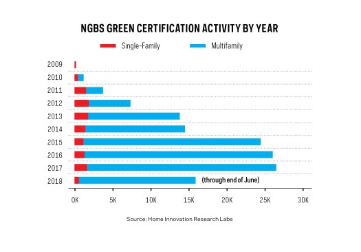Since the introduction of Home Innovation Research Labs’ NGBS (National Green Building Standard) Green Certification program in 2009, close to 150,000 homes and apartments have become certified. As of August, there were an additional 120,000 homes in-process for certification. As shown in the chart below, the program has shown steady growth year after year; based on strong growth for the first half of 2018, the program is once again on target to see an increase in the annual number of units certified.