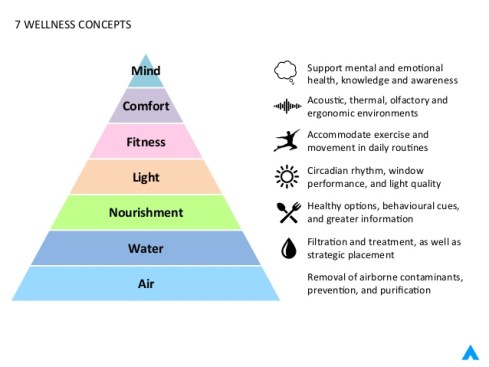 WELL’s seven codes include requirements such as water and air filtration systems that limit exposure to pathogens and allergens, and kitchen sinks must have two or more basins and a swiveling faucet to lower the risk of food contamination. Also, any WELL-certified establishment is recommended to be located within half a mile from—or provide free transportation to—a grocery store or farmers market where fresh produce is sold. A healthy sleep-wake cycle is encouraged through a circadian lighting system that requires blackout shades and dawn simulation to establish a “bed time” and “wake time”, and placing decibel limits on interior and exterior noise reverberation.