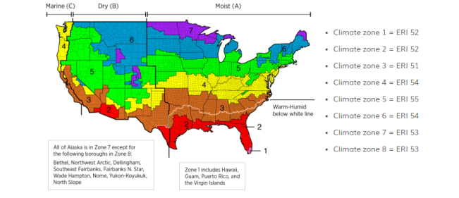 Under the ERI path, each home has a goal number based on the climate zone. (Climate zone map courtesy of the IECC)