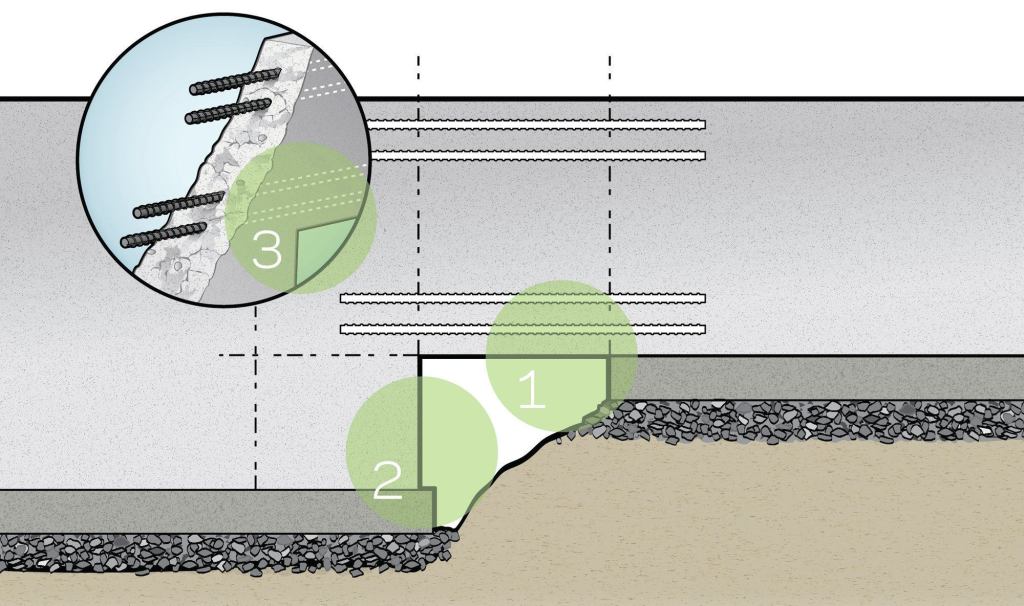 3. Reinforcing To enable the wall section to function as a beam, install two #4 steel reinforcing rods at the top and bottom (extending 3 feet into the main wall).