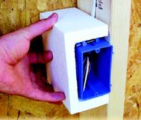 Molded from foam insulation, the EnergyBlock fits around standard electrical outlet and light switch boxes to seal out drafts, providing R-10 insulation. EnergyBlock is sealed after rough wiring is complete. Pine Ridge Builders. 701.320.1111. www.energyblock.com.Circle 158