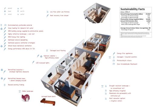 Among the intriguing features integrated into this project: 90% high-efficacy lighting, an optimized insulation package, salvaged lumber, high-efficiency hydronic heat, solar water heating, a 1.8-kW PV system, phase-changing drywall, smog-reducing exterior stucco, zero-VOC interior paints and sealants, and a 1,150-gallon rainwater catchment system.
