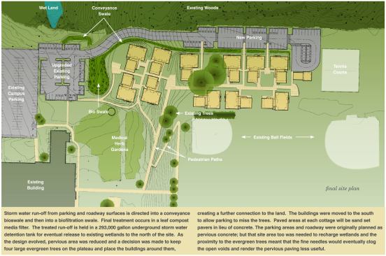The residents, 12 to a cottage, enjoy their own private bedrooms and bathrooms, each with low-flow faucets and showerheads and dual-flush toilets. Other amenities include washing machines with a Water Factor of 3.85, Energy Star–rated appliances and lighting fixtures, individual programmable thermostats, and built-in study nooks.