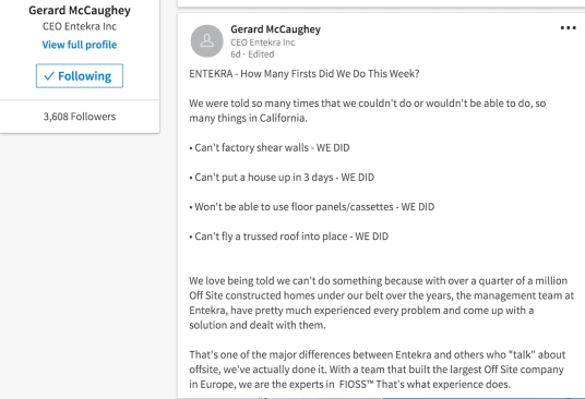 Here’s the tale of the tape on the Los Banos home Entekra erected last week according to Entekra ceo, founder, and principal Gerard McCaughey, who’s been through all of this before in Europe, starting almost three decades ago.