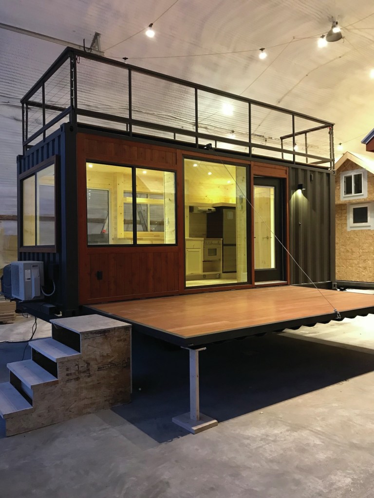 The ESCAPE Vista C model is built in a standard ISO shipping container, measures 20 feet by 8 feet, and has an optional rooftop terrace that spans the width of the home, a wooden, motorized drop-down deck, off-grid setup and a trailer for easy towing. The tiny home can sleep two residents and features a bedroom/living area with daybed and storage, a kitchen with full-size refrigerator, range, deep stainless steel sink, tall storage cabinets and butcher block countertops. The bathroom features a full size shower, sink and Toto toilet.