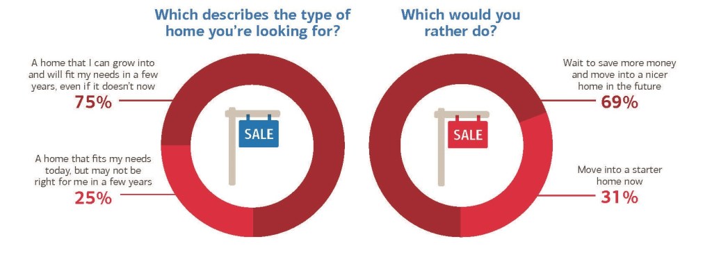 According to the survey, first-time buyers today want a home they can grow into (75%) and would rather wait to save more money for a nicer house in the future (69%). When asked why they haven’t purchased a home yet, 56% of respondents said they didn’t think they could afford a home or the type of home they want – only 34% said it’s because they’re still paying off debt.