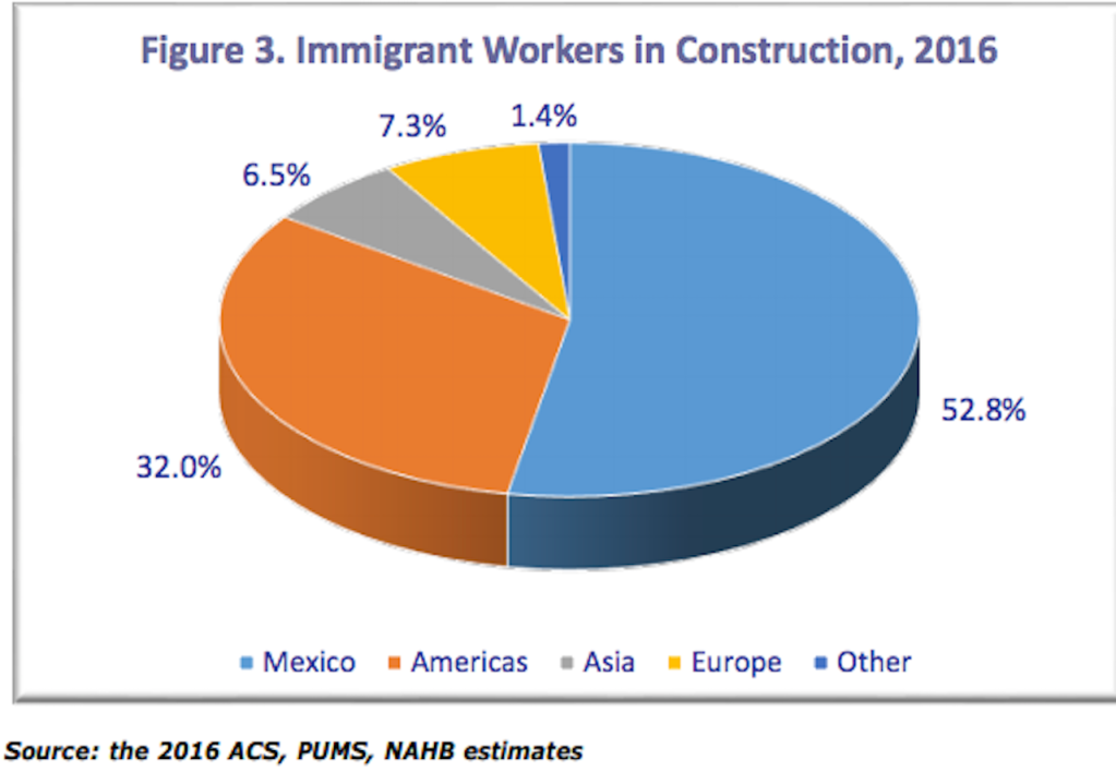 NAHB data looks through a geographical lens here, noting that California and Washington, D.C. are where immigrants represent the highest percentage of construction work forces–42%–with Texas, New York, Nevada, and Florida all with 35% or more immigrants in their respective construction labor pool. Dr. Siniavskaia writes: