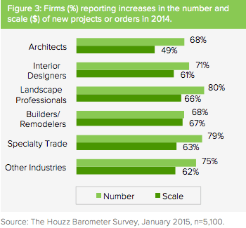 The Q1 2015 Houzz Barometer revealed consistent revenue growth across the residential construction industry, which was fueled by improvements in both the number and scale of new projects or orders
