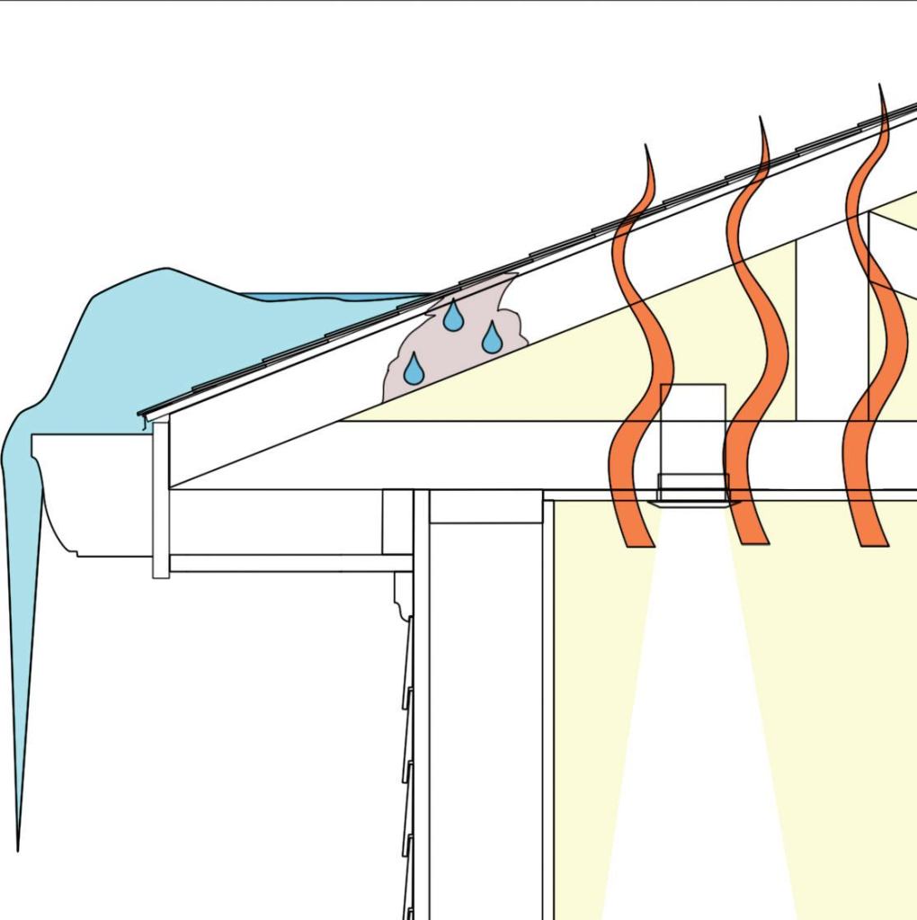 Ice dams occur when melting snow on a roof reaches the eaves or an otherwise unvented or uninsulated portion of the roof that is colder than the attic space that is incidentally heated from the conditioned areas below it. That dynamic causes subsequent snowmelt to pool up and seep under the shingles and/or down the perimeter wall cavity. And that can result in a host of moisture-related problems, most of them latent, long-term, and costly.