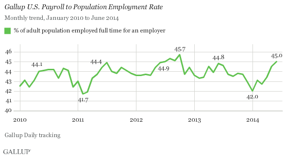 Gallup’s Payroll to Population employment rate climbed to 45.0% in June, one of the highest monthly averages in the four-year trend. Gallup’s unadjusted monthly unemployment rate fell to a record-low 6.8%.